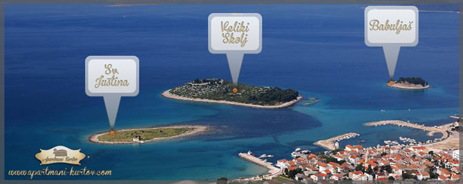 Naši apartmani smješteni su u turističkom mjestu Pakoštane smještenom u samom središtu Dalmacije sa jedinstvenim položajem između mora i ribom bogatog Vranskog jezera (najveće prirodno jezero u Hrvatskoj, oko cijelog Parka prirode proteže se biciklistička staza duga 50 km, aktivnosti koje Vam se nude: pecanje, biciklizam, kupanje u jezeru, škola jahanja), u kojem se turizam razvija od 60-ih godina, kada se grade turistička naselja. Ugođaju pridonosi okoliš - stara borova šuma, lijepe uređene plaže i uvale, a iz Pakoštana se pogled pruža na tri otočića: Otočić sv. Justina na kojem sa nalazi samo mala crkvica. Veliki Školj, i Babuljaš. Okruženo je nacionalnim parkovima Kornati, Krka, Paklenica te Plitvička jezera i dva parka prirode Telašćica i Vransko jezero. Jedinstvene ljepote okružuju Pakoštane.